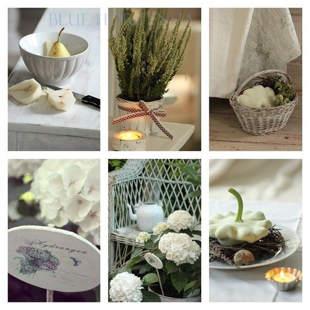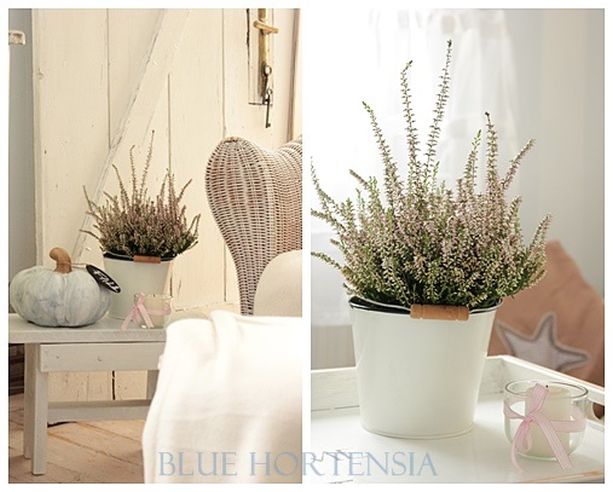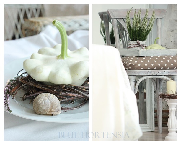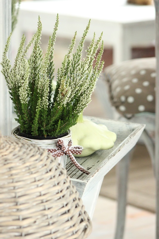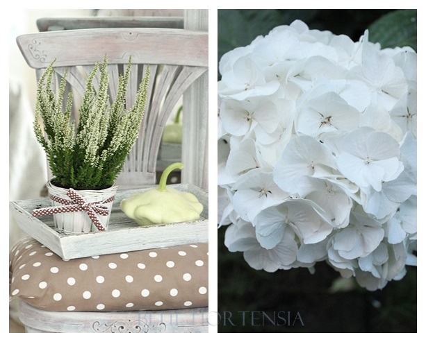 Hlavnú úlohu zohrávajú obľúbené vresy (Calluna) a hortenzie (Hydrangea). Potom sú to samozrejme tekvice (v tomto prípade biele), ktoré sa v posledných rokoch stali obľúbeným symbolom jesene.