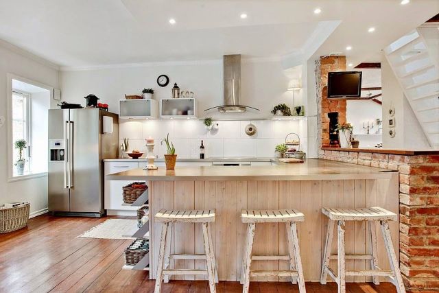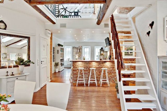 Prevahu bielej farby veľmi príjemným spôsobom „rozbíjajú“ drevená podlaha, stropné trámy a tehlové steny. Otvorený priestor je členený na niekoľko samostatných častí, ktoré sa od seba tematicky a štýlovo líšia.